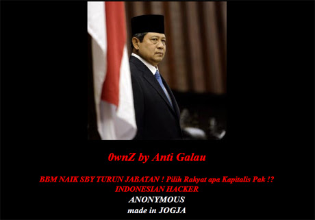 Inilah kata-kata yang terpajang pada beberapa situs yang dibobol oleh hacker sebagai bentuk penolakan atas kenaikan harga BBM yang direncakan oleh Presiden, tidak saja ditentang melalui demonstrasi di jalanan, yang dilakukan oleh masyarakat, organisasi dan mahasiswa.